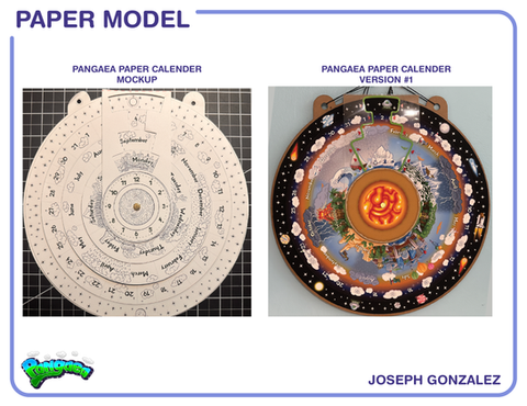 A clock calendar named after the supercontinent showcases my artistic design flair. Step into my toyetic mind as this piece highlights my skills in illustration and construction, symbolizing an interconnected world and my creativity. All illustrations are vector-based and created using Adobe Illustrator. The center housing was 3D modeled and engineered in SolidWorks before being 3D printed and produced in two sizes: a smaller 12-inch scale and a larger 20-inch version. The larger version allows for better visibility of details. Each rotation activates a clicking mechanism, enhancing user interaction with precisely calibrated components for smoother disc movement.